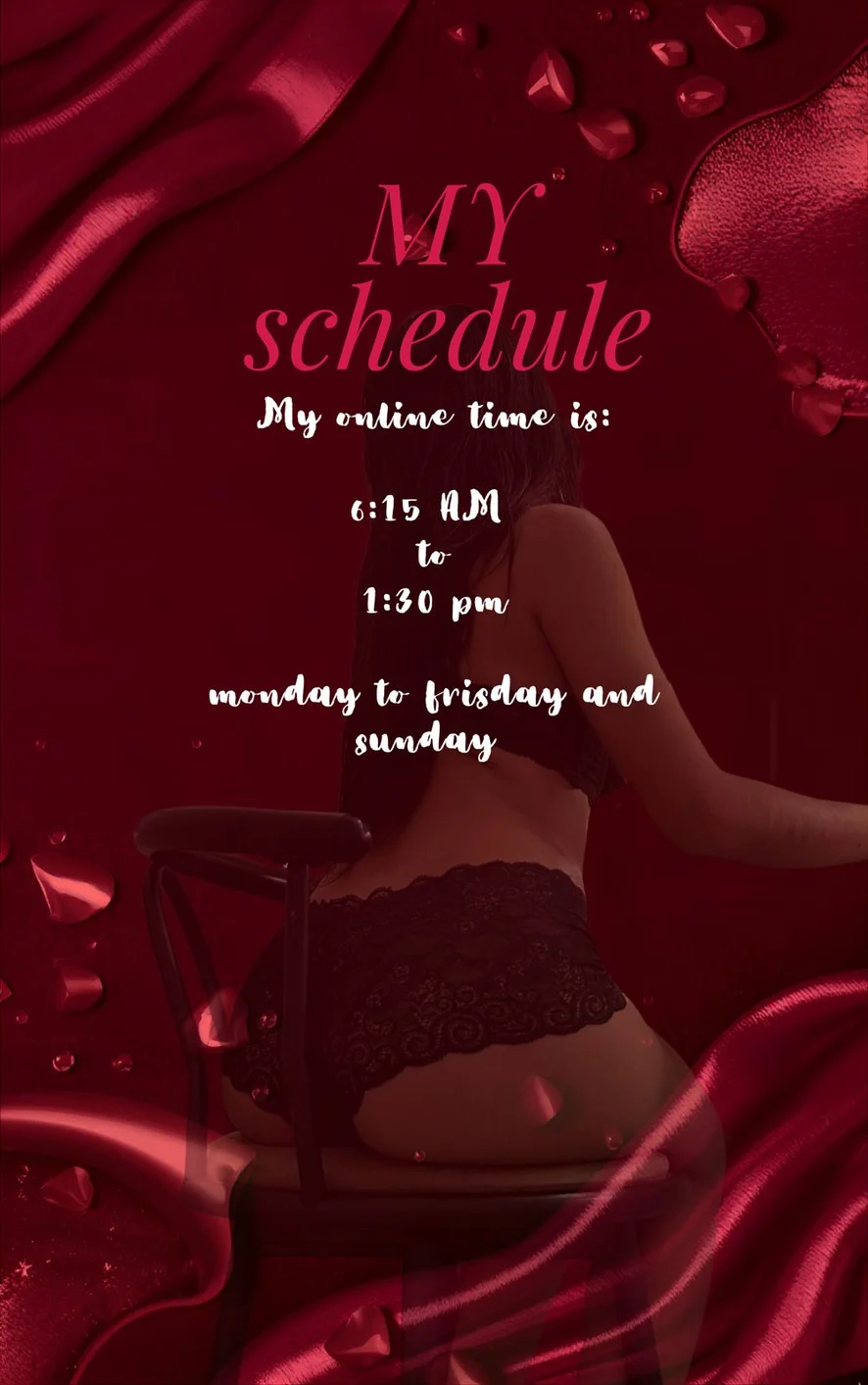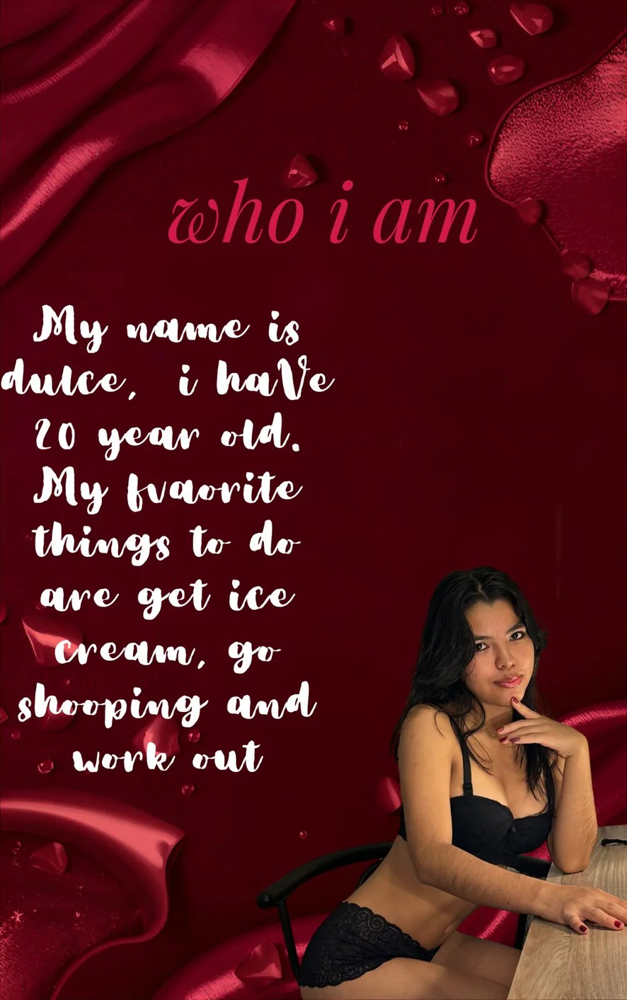 Спанкінг, Еротичні танці, Стриптиз, Масаж, Мінет, Між грудьми, Тверкінг, Топлес, Фут-фетиш, Брудні розмови, Мастурбація пальцями, Глибоке горло, Олійне шоу, Поза вершниці